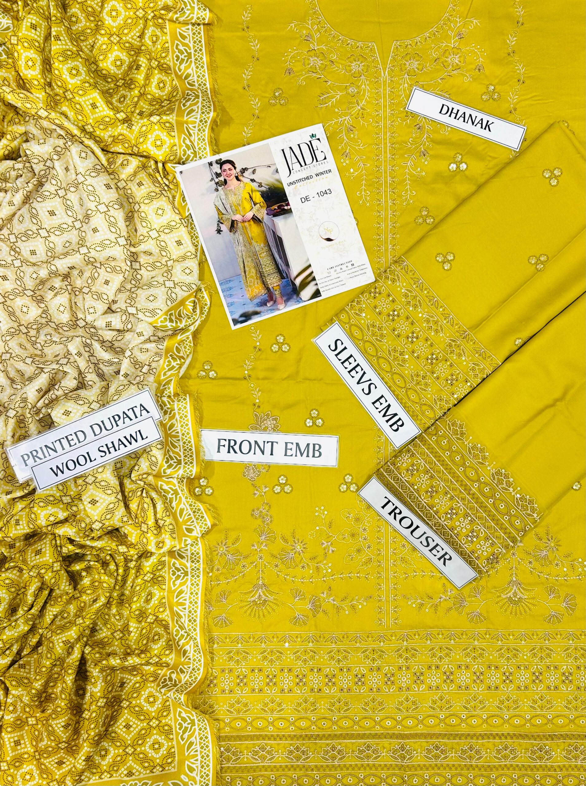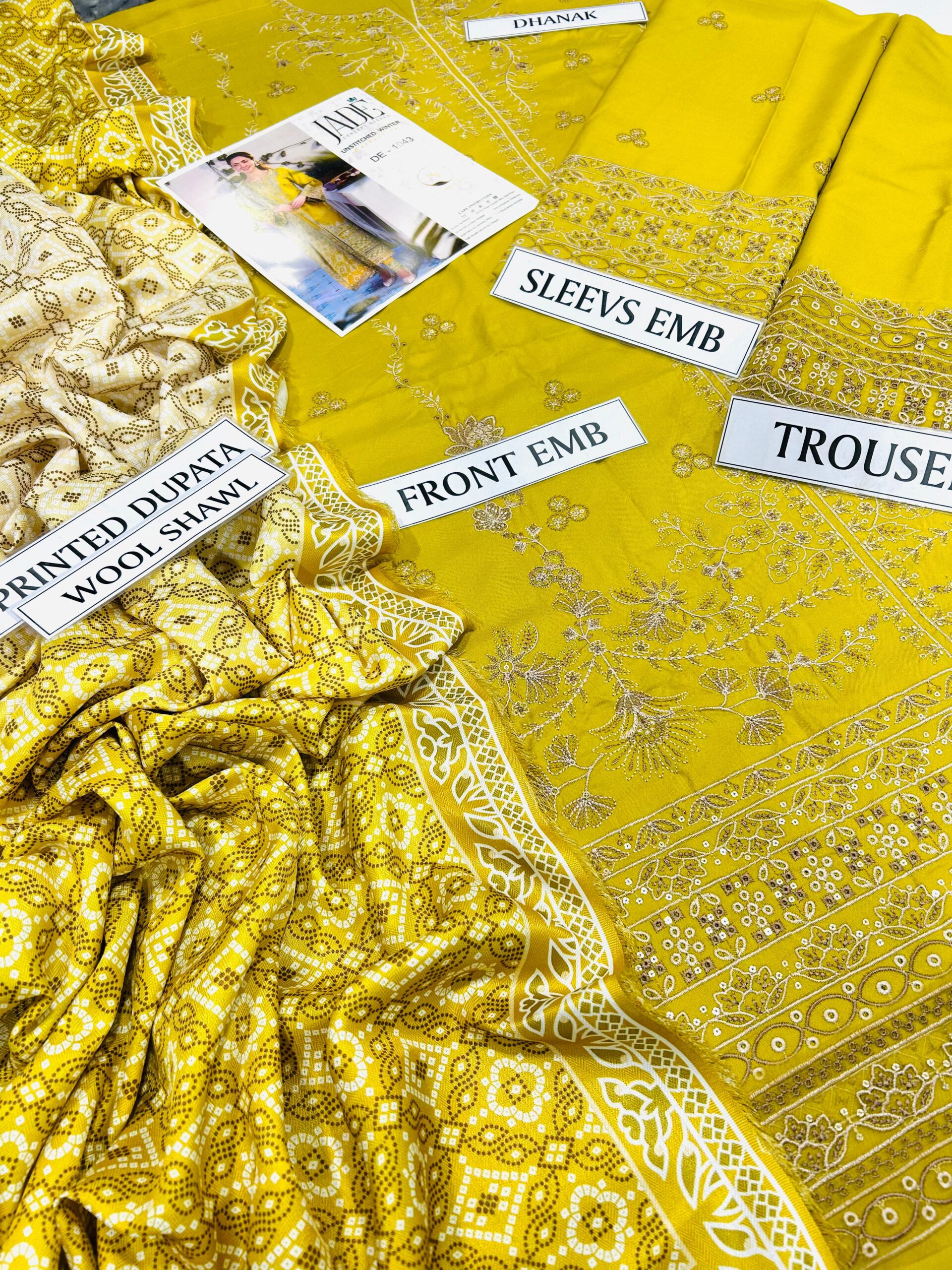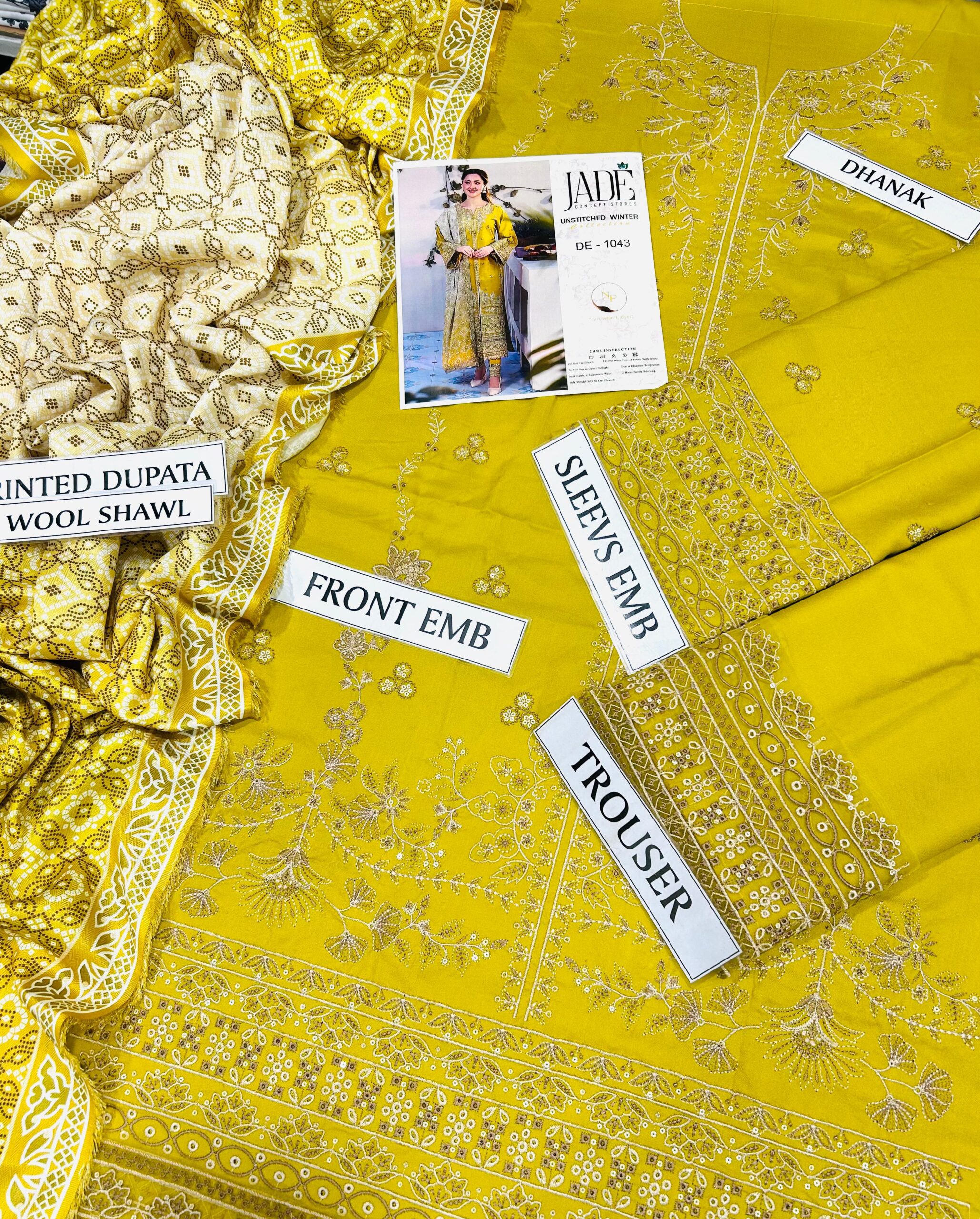 Bring star-inspired elegance to your wardrobe with the Jade Premium Air-Jet Dhanak Collection. Made with 💯% guaranteed Dhanak quality fabric, this 3-piece embroidered suit is the perfect blend of luxury, comfort, and winter warmth.