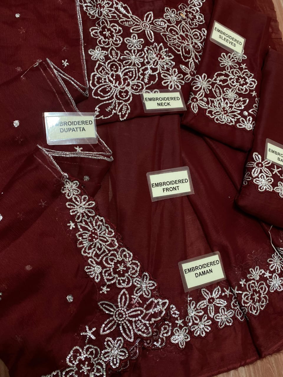 Dupatta: Embroidered chiffon dupatta with 4-side overlock and bunches attached – ready to wear