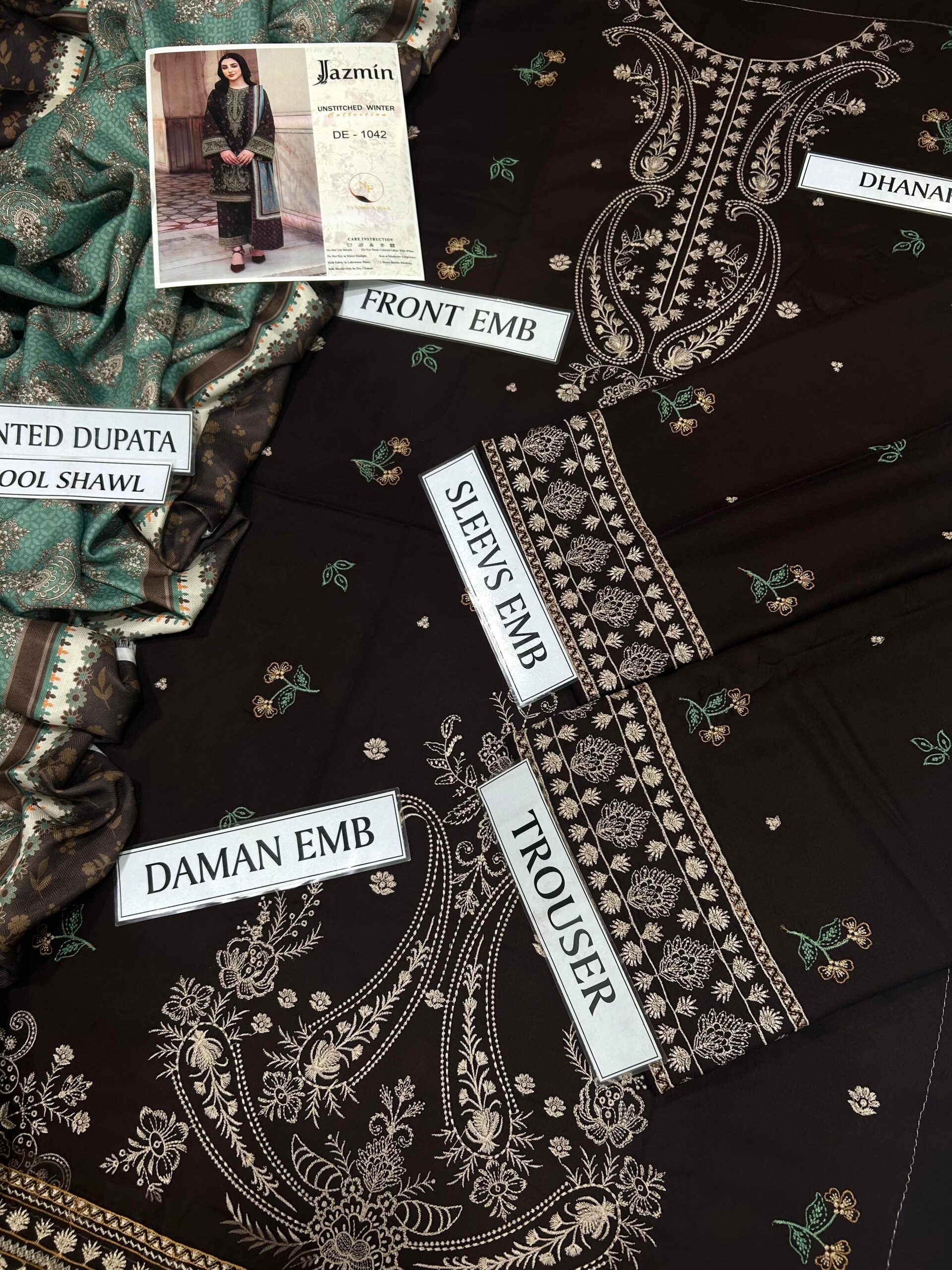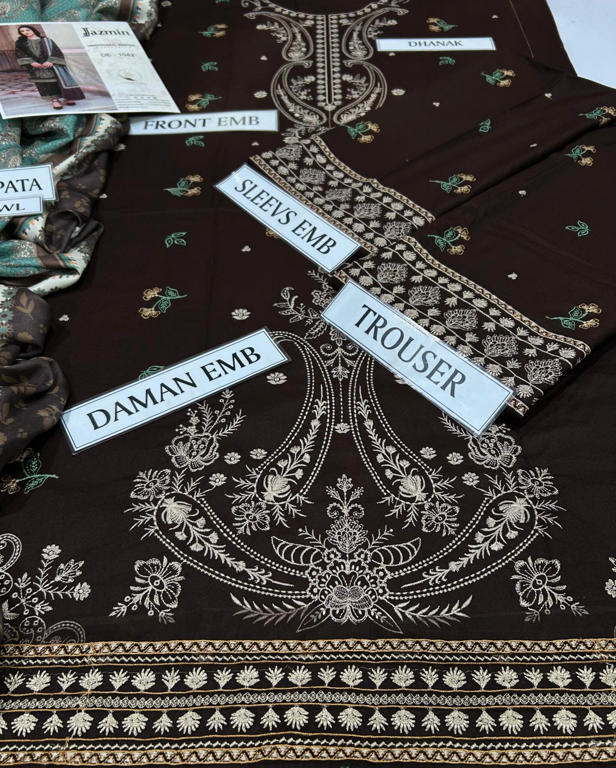 Upgrade your wardrobe with our exclusive Women’s Dhanak Fancy Party Wear Suit – designed for modern elegance and comfort. This 3-piece embroidered suit features: