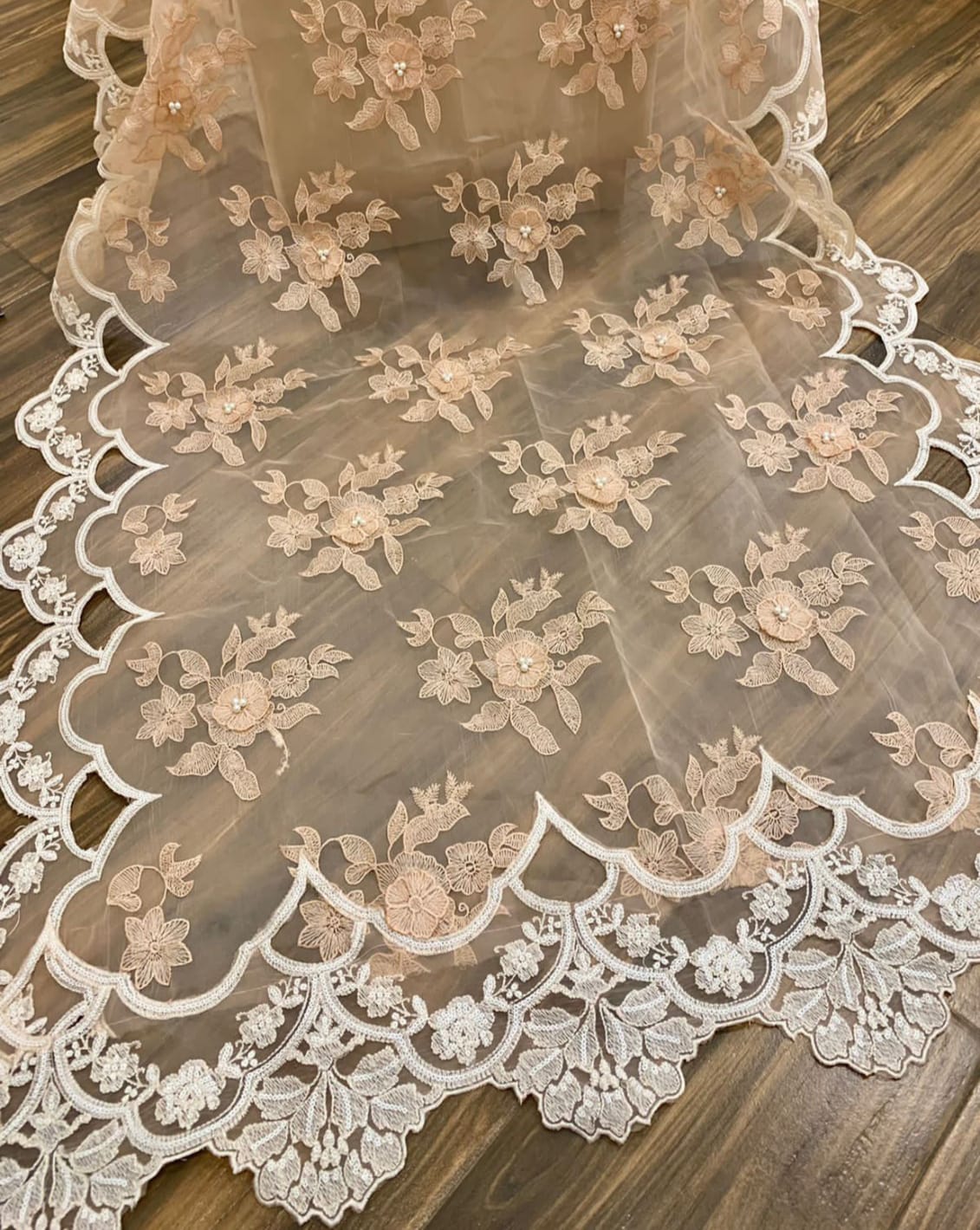 Dupatta: Organza dupatta with heavy embroidery, 3D flowers, cutwork edges, and embroidered pallou borders.