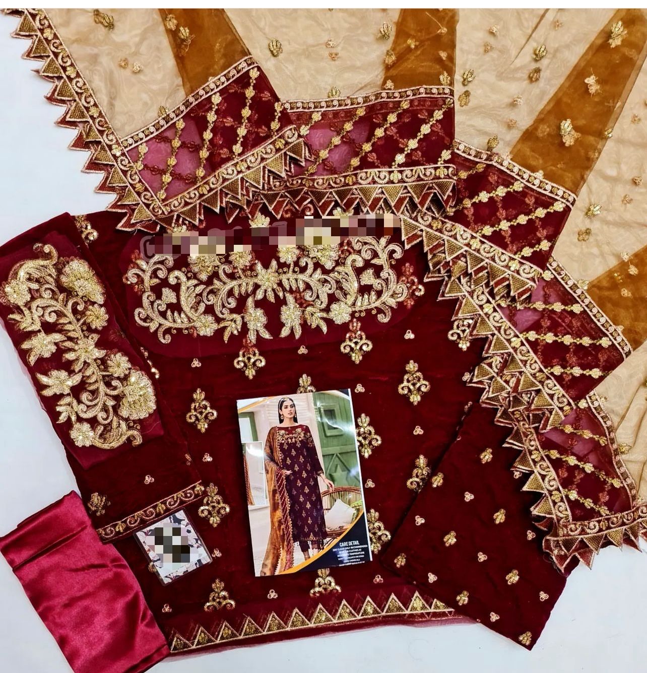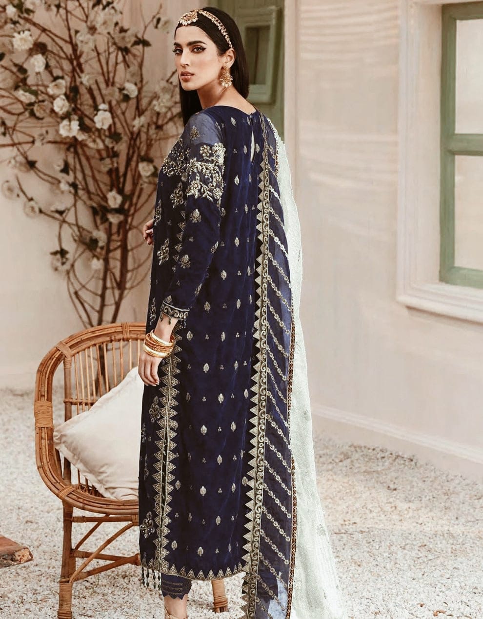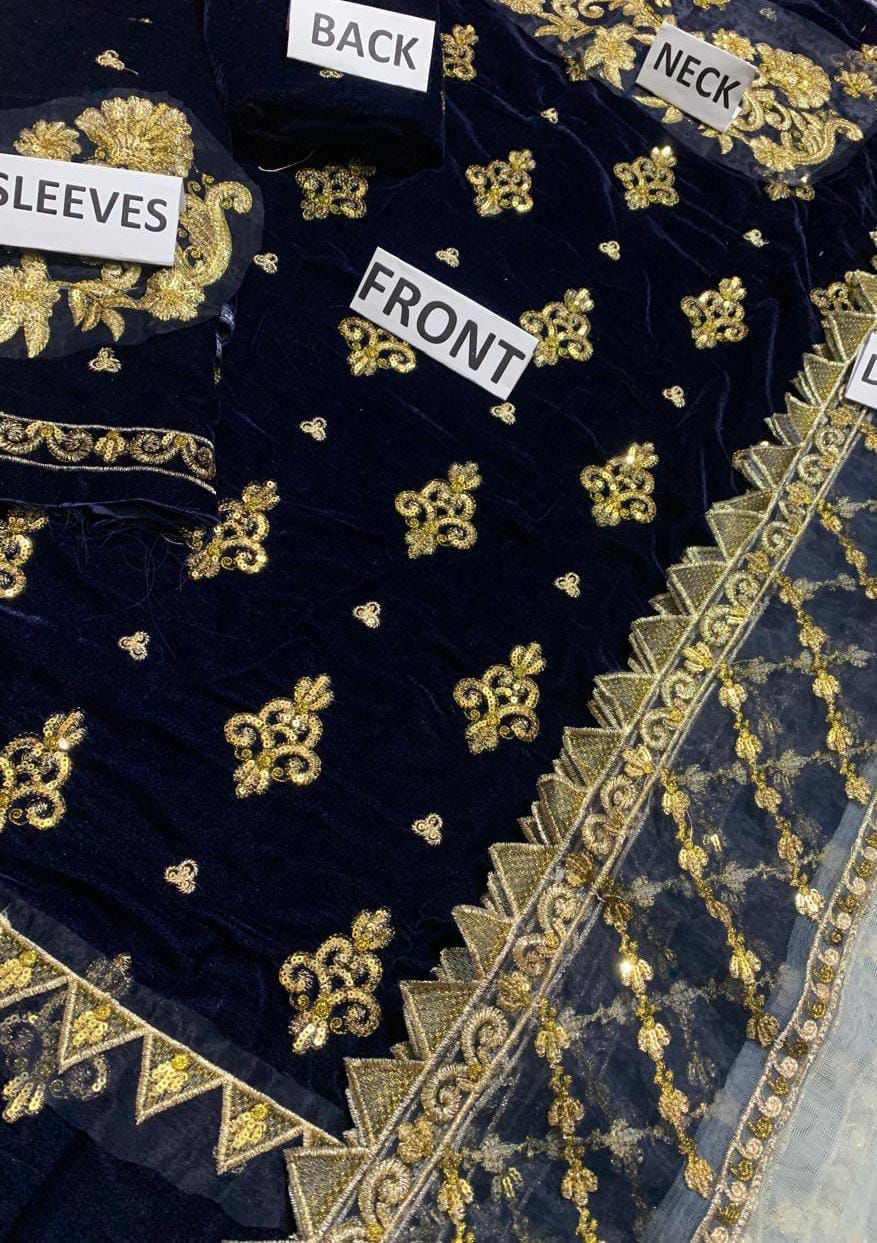 Front Velvet Embroidery: Full heavy embroidery for a luxurious look.