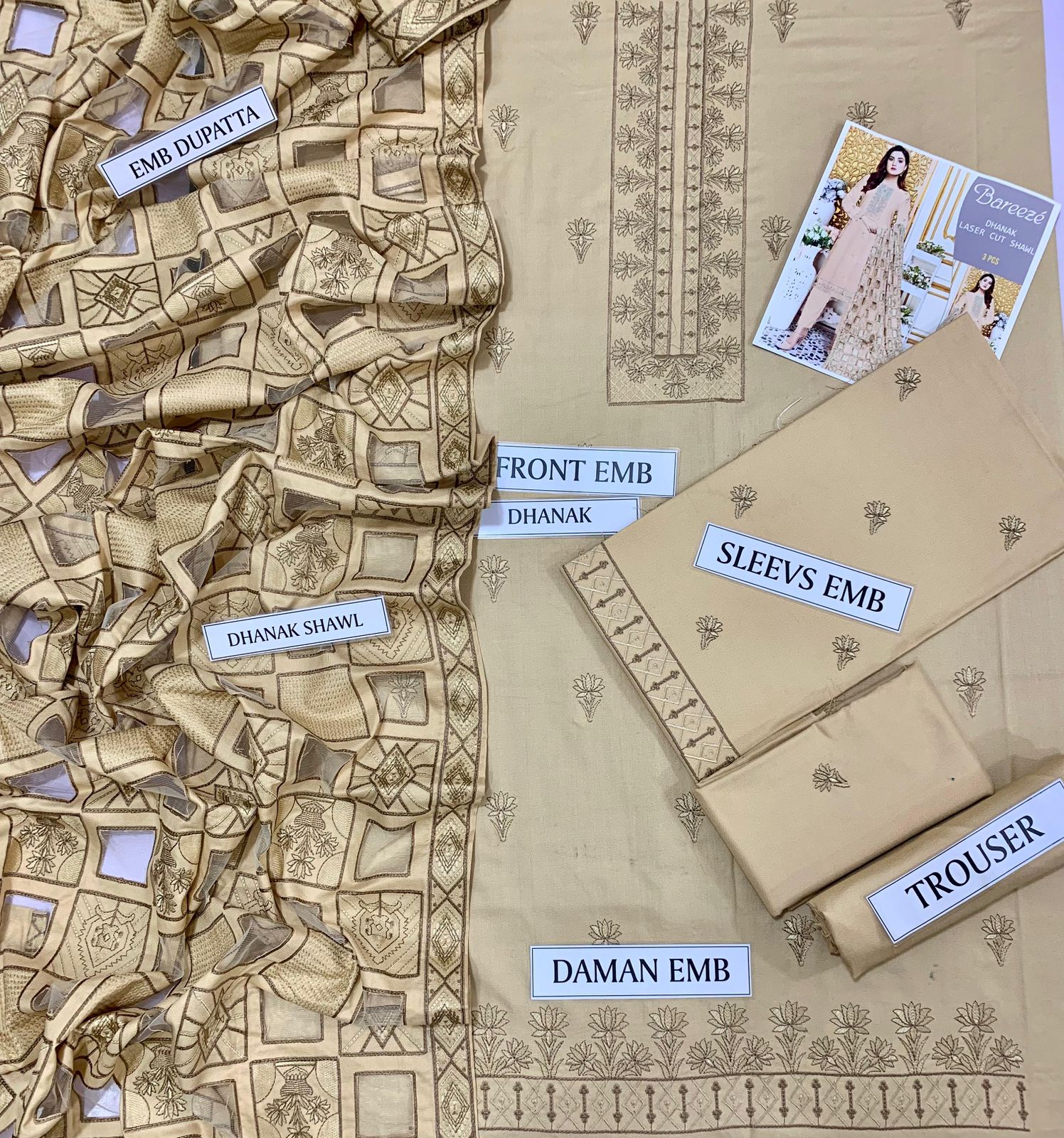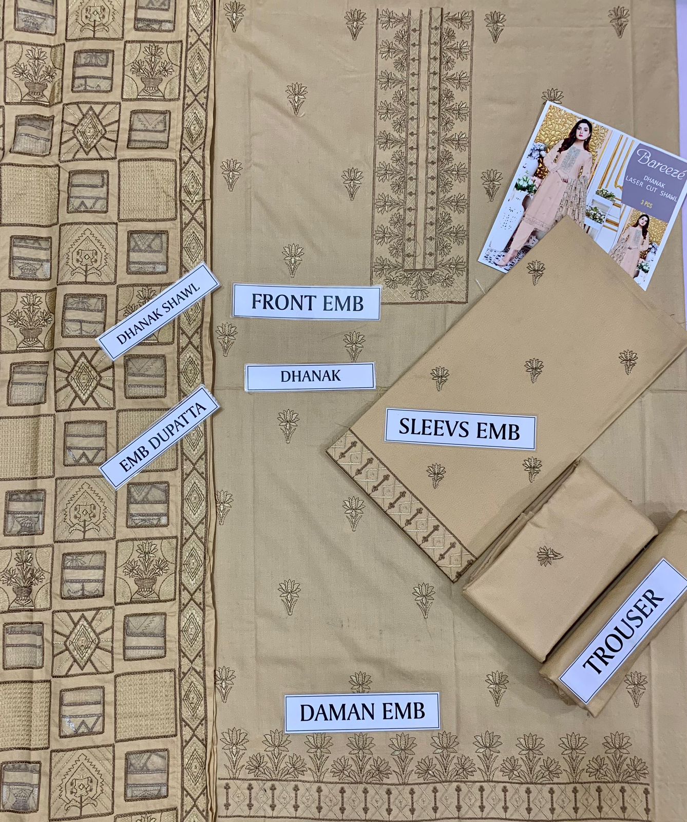 Upgrade your wardrobe with our exclusive Women’s Dhanak Fancy Party Wear Suit – designed for modern elegance and comfort. This 3-piece embroidered suit features: